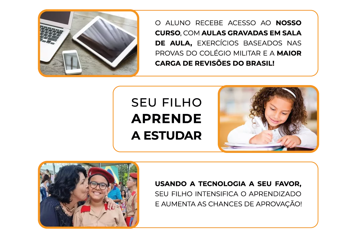 Possuímos uma metodologia própria, sendo constantemente validada há décadas por milhares de alunos e famílias que passaram por aqui, resultando sempre em excelentes aprovações no Colégio Militar. Nossa metodologia trabalha em conjunto os pais, alunos e professores, com aulas com dicas para que os pais participem do processo, aumentando as chances de aprovação!